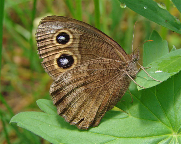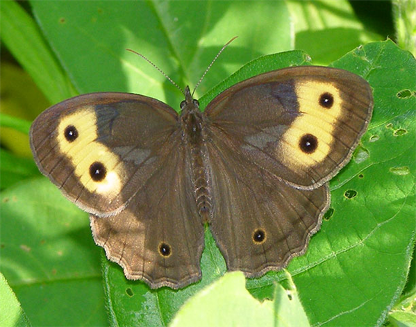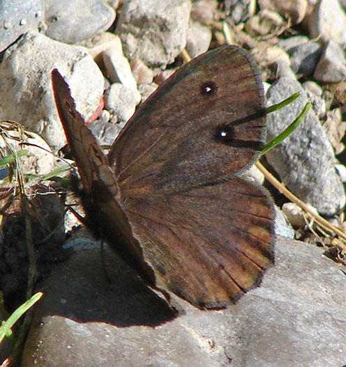One of our largest satyrs, and like other satyrs, this dark brown species of grasslands and open grassy woods, flies with a characteristic bouncing trajectory. South of the black line on the map, most populations have a yellow patch on the forewing, while north of the black line, most populations lack these yellow patches.