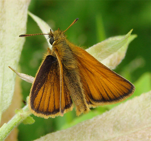 Another small, weakly-flying, orange grass-skipper that is almost unmarked. A non-native species, its short, orangish antennas help to distinguish it from similar native species.